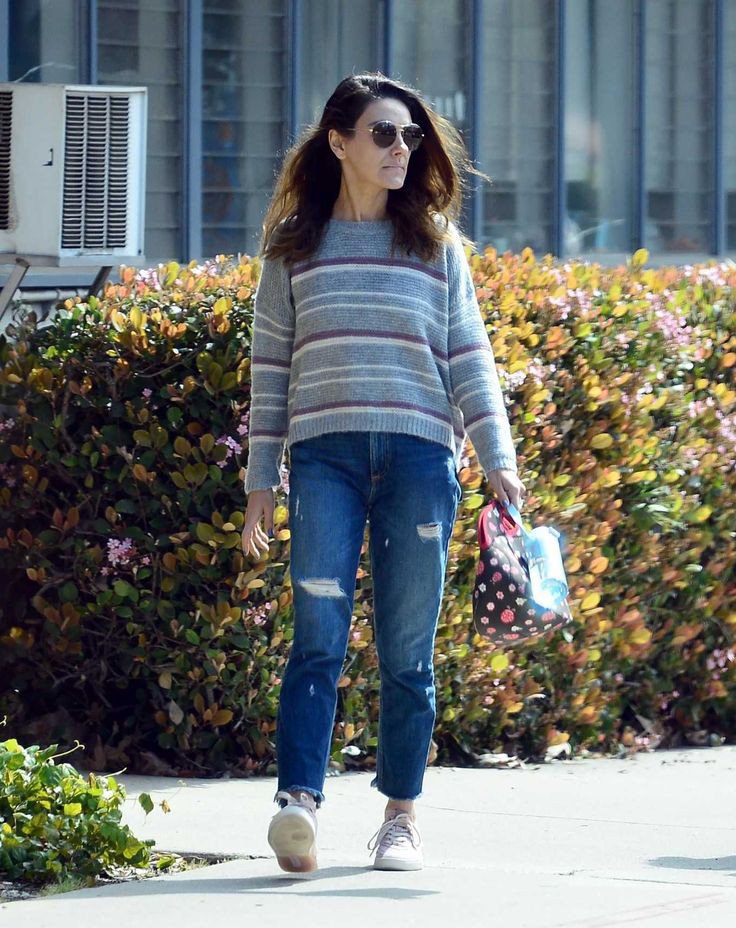 You can take a look at the picture, she has worn a striped sweater, which is dividing her body in parts, it means your vision is also divided and she seems to be short.